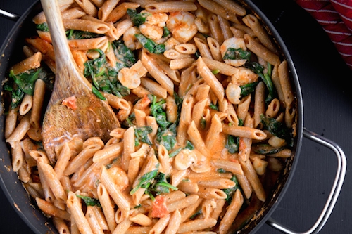 Start to finish, this tasty pasta takes only 15 minutes to make! The rich cream sauce uses greek yogurt to reduce calories, while plump shrimp add protein.