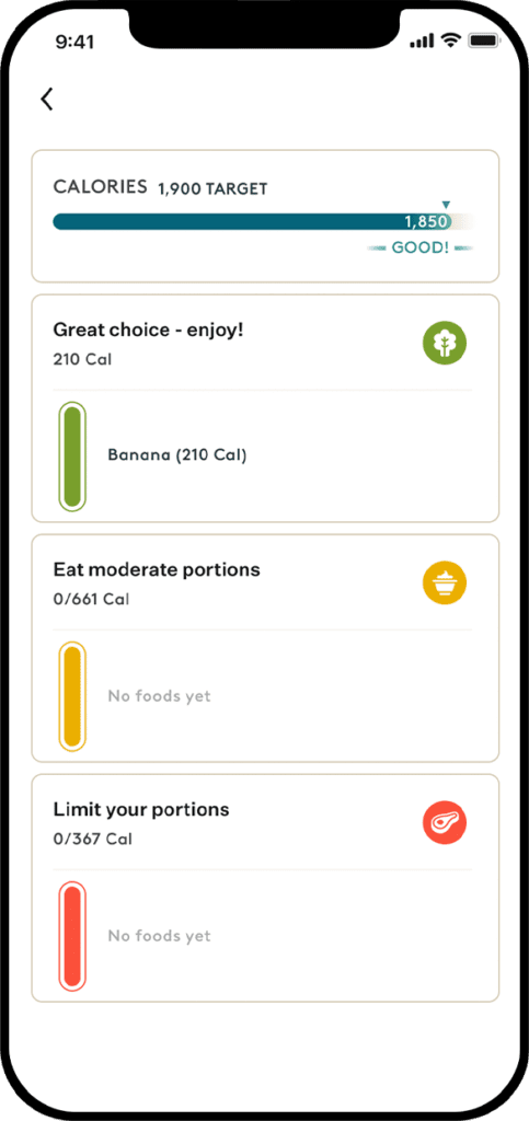 Noom Weight guides you to stay within your calorie range by showing you foods that will actually satisfy you on fewer calories, not just foods you should avoid.
