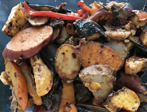 8.) Auf einem Backblech (oder 2): Verteile die Mischung auf Backbleche. Bestenfalls Backbleche, die gegebenenfalls etwas Flüssigkeit auffangen können, da sich durch das Olivenöl etwas ansammeln kann. Eine Lasagne-ähnliche Form eignet sich ebenfalls.