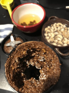 3) Zunächst die Kruste: Wichtig ist, dass ihr die Datteln oder Rosinen in etwas warmen Wasser einweicht (20 min-60 Minuten) – Alle Zutaten der Kuchenboden in den Mixer geben und so lange vermischen, bis sich eine fest-flüssige Mischung ergibt.