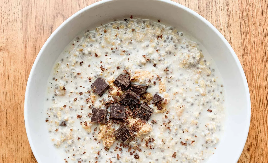 - Una vez que esté todo bien mezclado, decorar con los trozos de chocolate. Tapar el bol o frasco y refrigerar al menos por 4 horas o toda la noche.