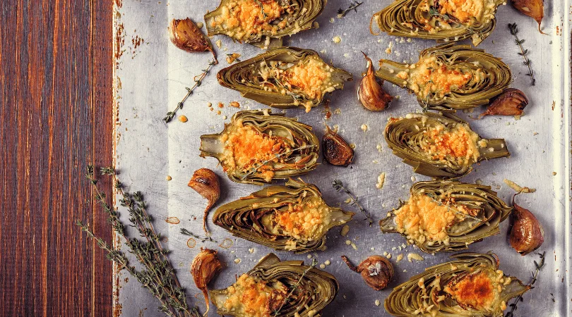 Opcional: Colocar en la bandeja un poco de tomillo fresco y dientes de ajo sin pelar para que aromatice las alcachofas mientras se hornean.