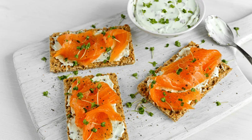 2. Colocar las láminas de salmón ahumado en las galletas o tostadas integrales, y decorar con brotes de berro, alfalfa o tu favorito.