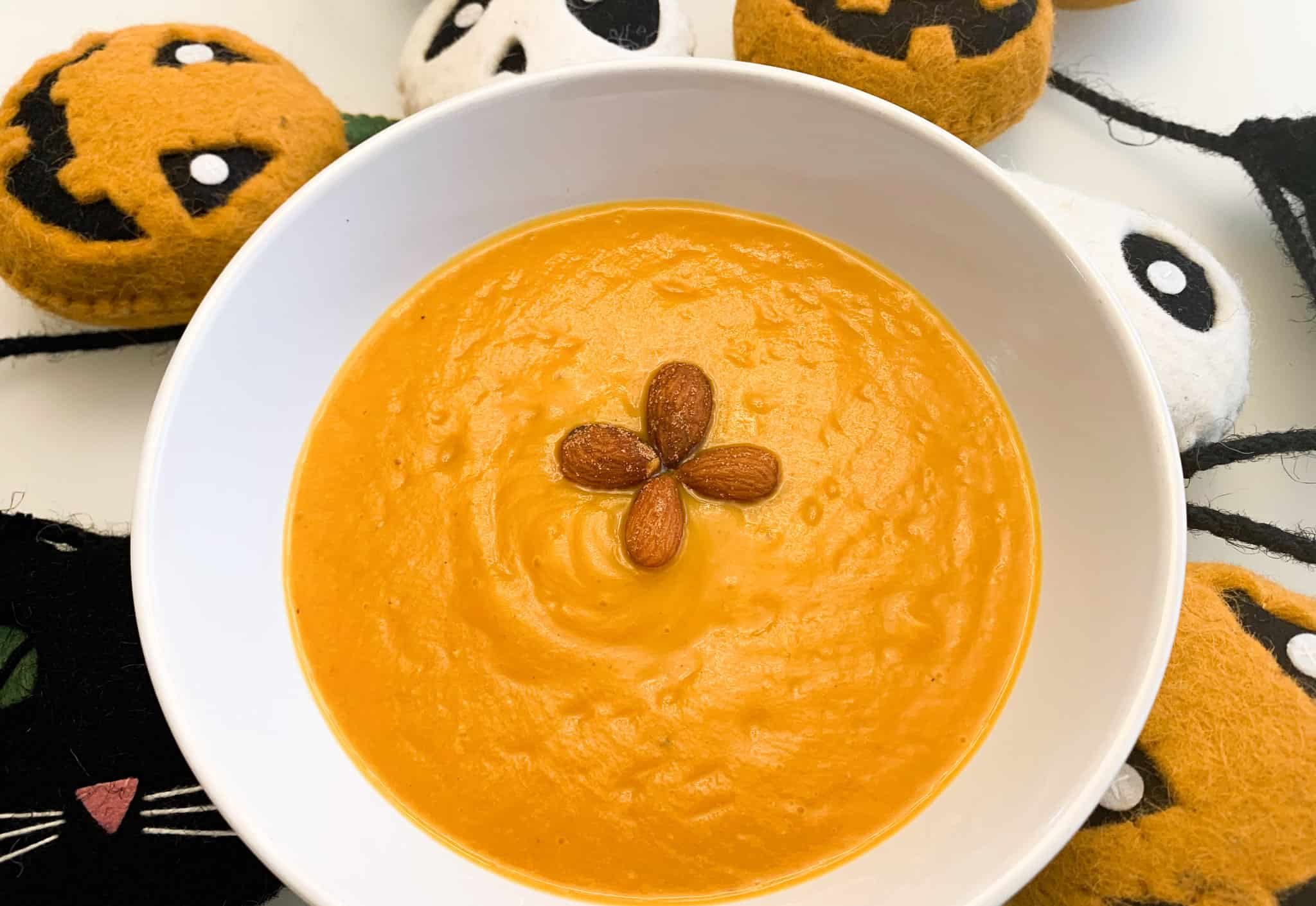 2. Licuar la calabaza sin piel, la cebolla,  el apio, la zanahoria y 1 diente de ajo (descartar los 2 restantes).