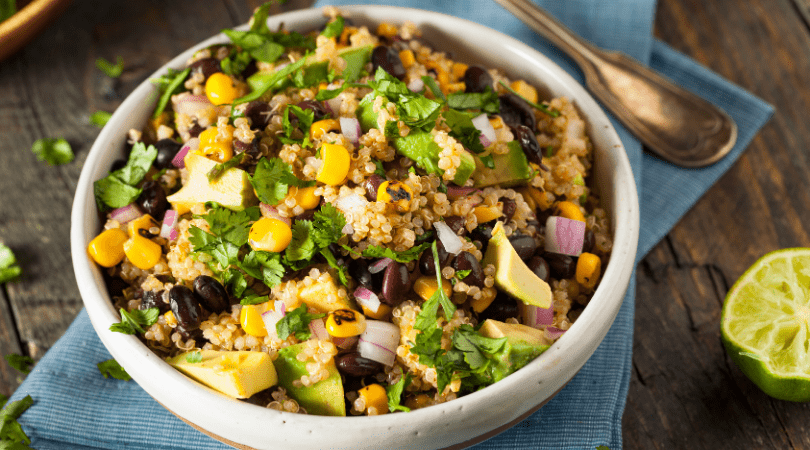 - Mezclar los frijoles/alubias, la quinua, el maíz, el pimiento, la cebolla, el cilantro y el jalapeño en un recipiente.