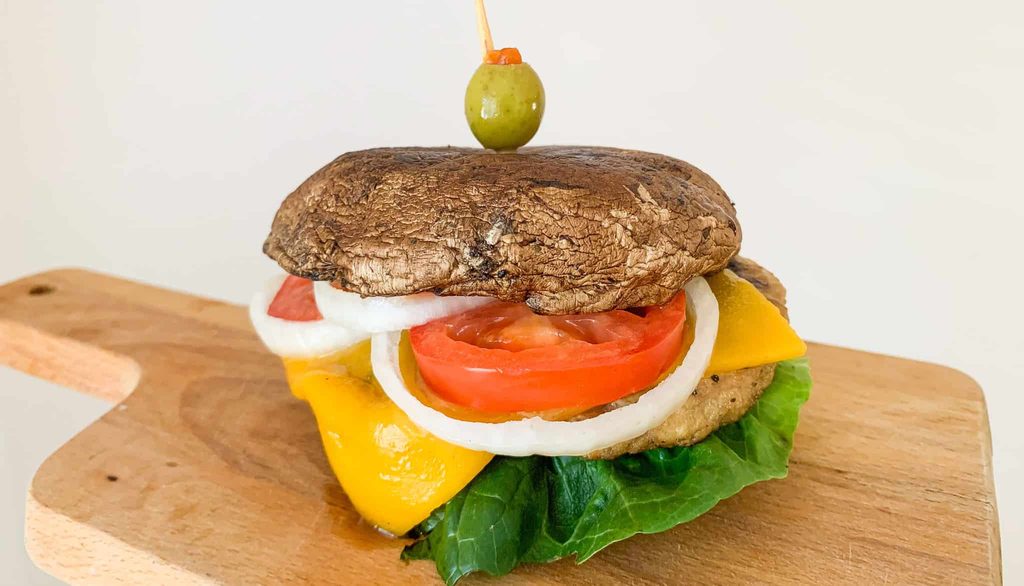 10. Ahora procede a armar la hamburguesa con la carne, el tomate, la lechuga y la cebolla (Opcional) usando el champiñon en lugar de pan, y ¡listo!, a disfrutar