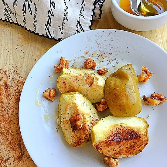 - Hornea a 400 ºF (200 ºC) entre 12-15 minutos hasta que las manzanas estén suaves y que las nueces estén doradas.