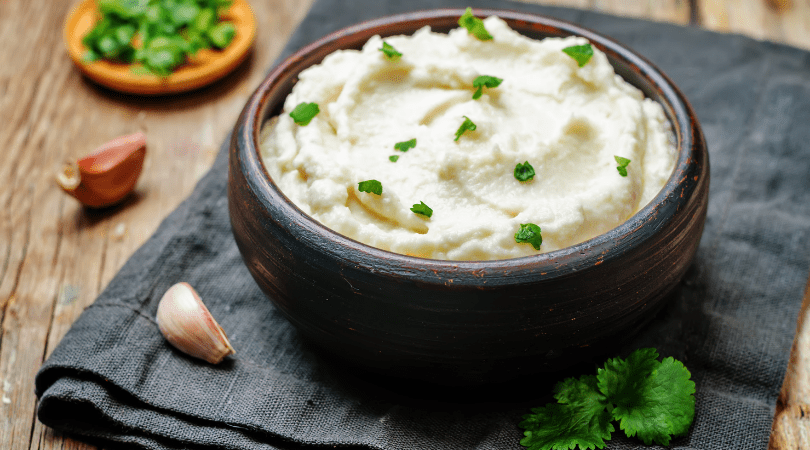 - Licuar (o procesar) la coliflor junto con el aceite, el ajo, el queso, la leche vegetal, la sal y pimienta hasta que se integre todo.